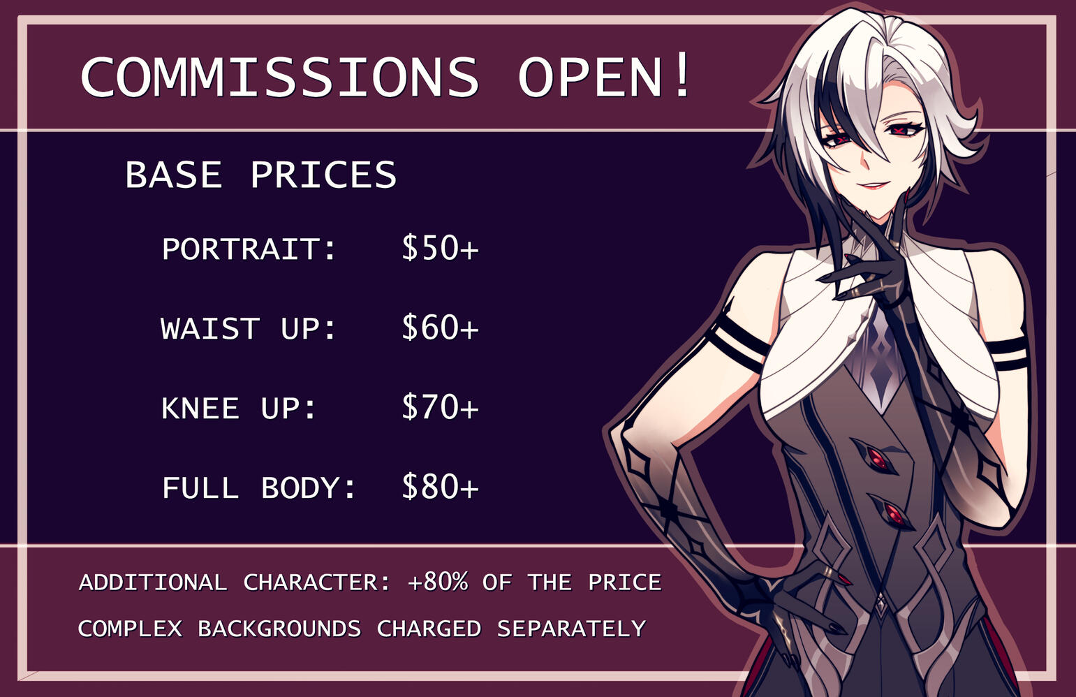 Upfront or after the first sketch- For private commissions I charge +20% of the price- For commercial use I charge +100% of the price- Turn around time: